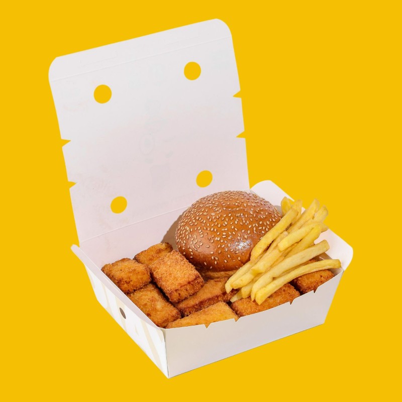(1717 سعرة حرارية)يقدم مع البطاطس المقلية وصلصة الثوم وصوص الطحينية وثلاثة كاتشب مع خيارك عادي او سبايسي